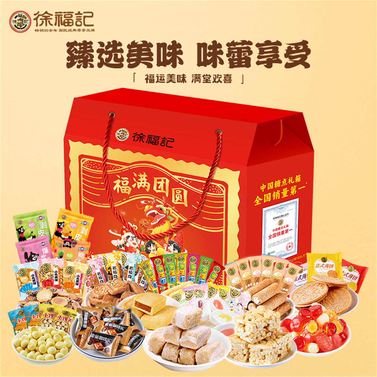 福满团圆 发布时间:2025-01-04点击:25 团购优惠请联系我们 内容物:1:徐福记酥心糖150克*2袋2:徐福记沙琪玛418克3:徐福记新年什锦糖120克*2袋4:100%果汁软糖120克*2袋5:米格玛110克*2袋6:徐福记凤梨酥200克7:雀巢咖啡乐(罐装)92g8:徐福记棉花糖242克9:徐福记综合饼点200克*2袋(小丸煎饼、岩板烧、京屋果子、卷心酥、法式薄饼等) 请填写您的信息 提交留言