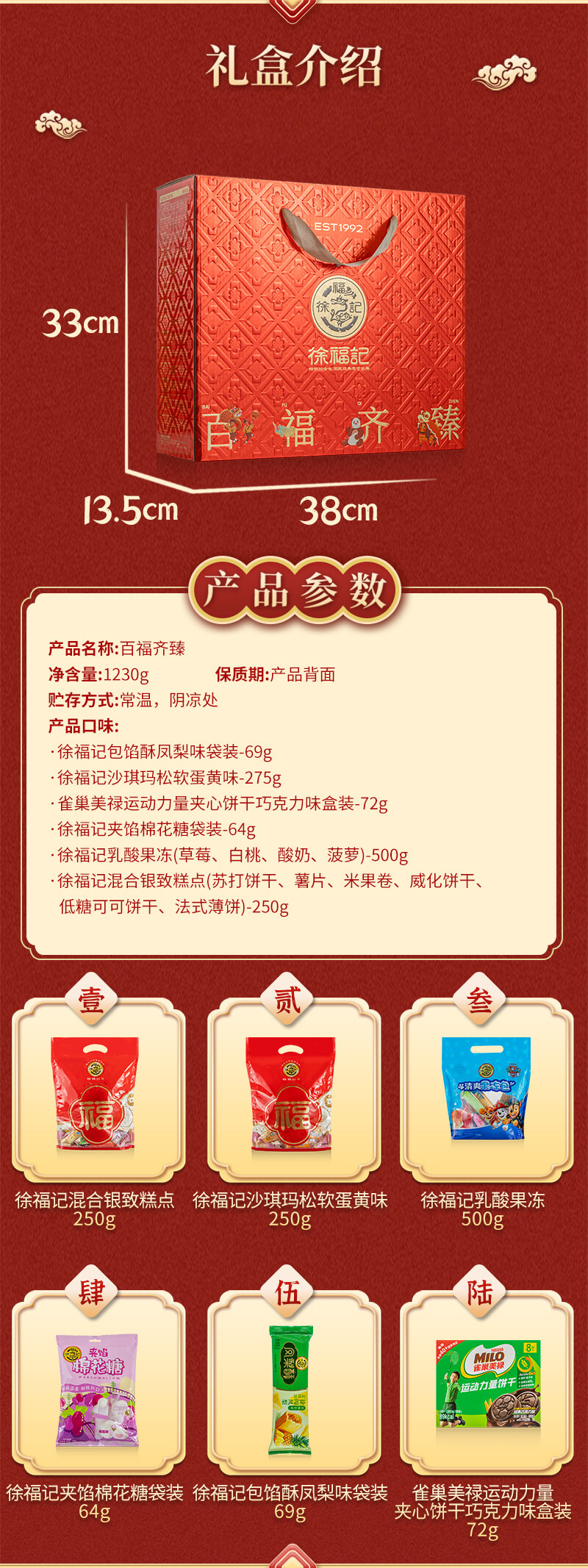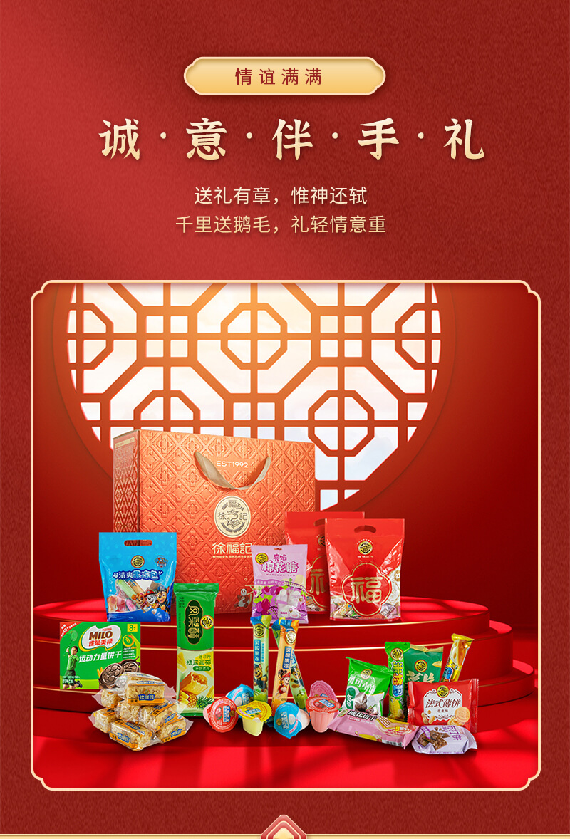 百福齐臻 发布时间:2025-01-04点击:29 团购优惠请联系我们 内容物:徐福记包馅酥凤梨味袋装69g徐福记沙琪玛松软蛋黄味275g雀巢美禄运动力量夹心饼干巧克力味盒装72g徐福记夹馅棉花糖袋装64g徐福记乳酸果冻(草莓、白桃、酸奶、菠萝)500g徐福记混合银致糕点(苏打饼干、薯片、米果卷、威化饼干、低糖可可饼干、法式薄饼)250g 请填写您的信息 提交留言