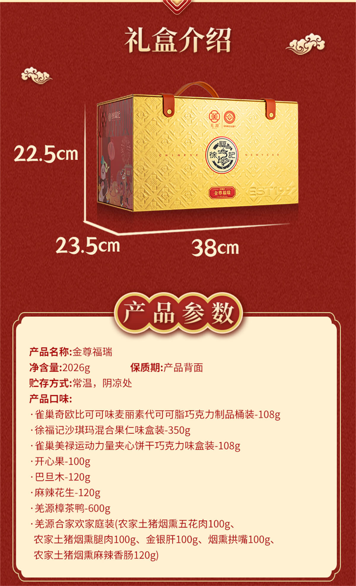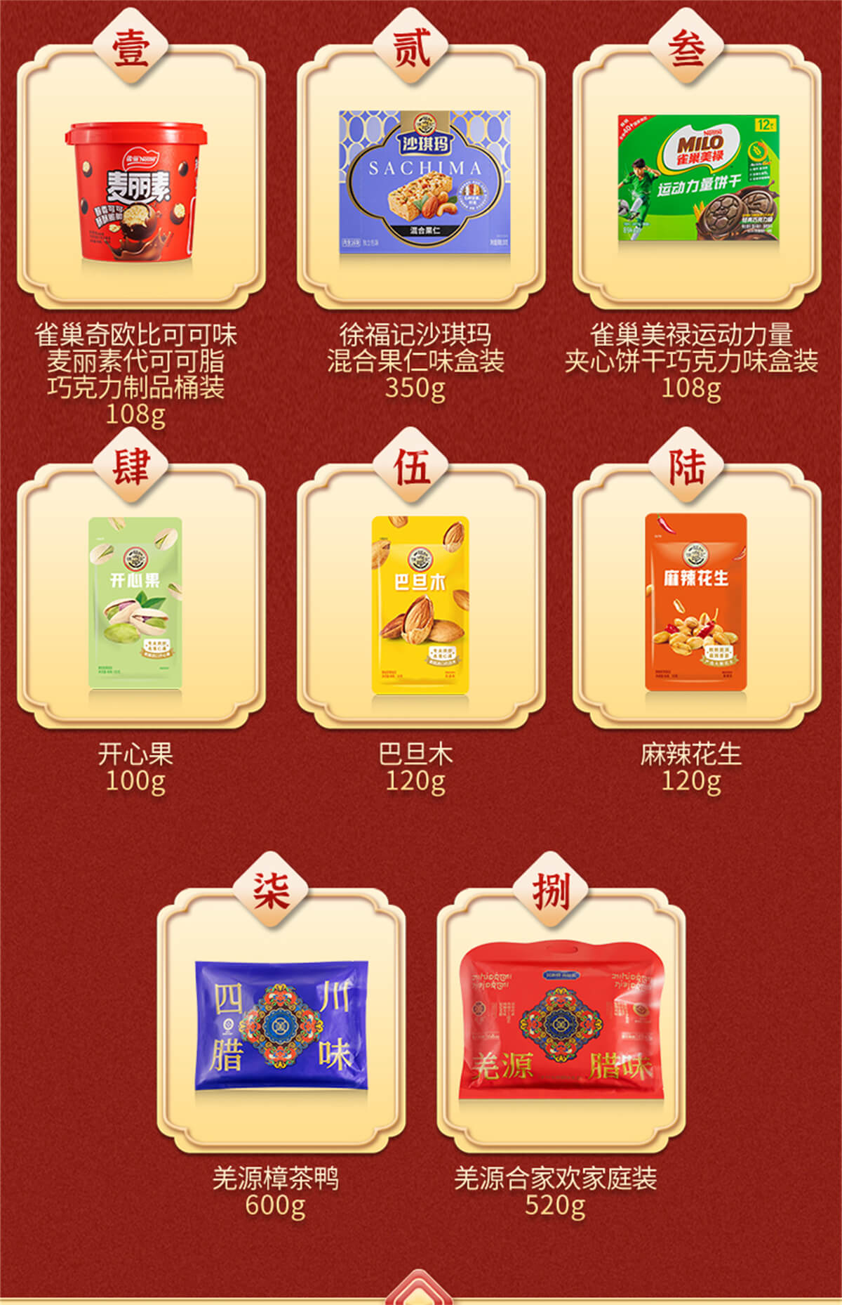 金尊福瑞 发布时间:2025-01-04点击:22 团购优惠请联系我们 内容物:雀巢奇欧比可可味麦丽素代可可脂巧克力制品桶装108g徐福记沙琪玛混合果仁味盒装350g雀巢美禄运动力量夹心饼干巧克力味盒装108g开心果100g巴旦木120g麻辣花生120g羌源樟茶鸭600g羌源合家欢家庭装(农家土猪烟熏五花肉100g、农家土猪烟熏腿肉100g、金银肝100g、烟熏拱嘴100g、农家土猪烟熏麻辣香肠120g) 请填写您的信息 提交留言