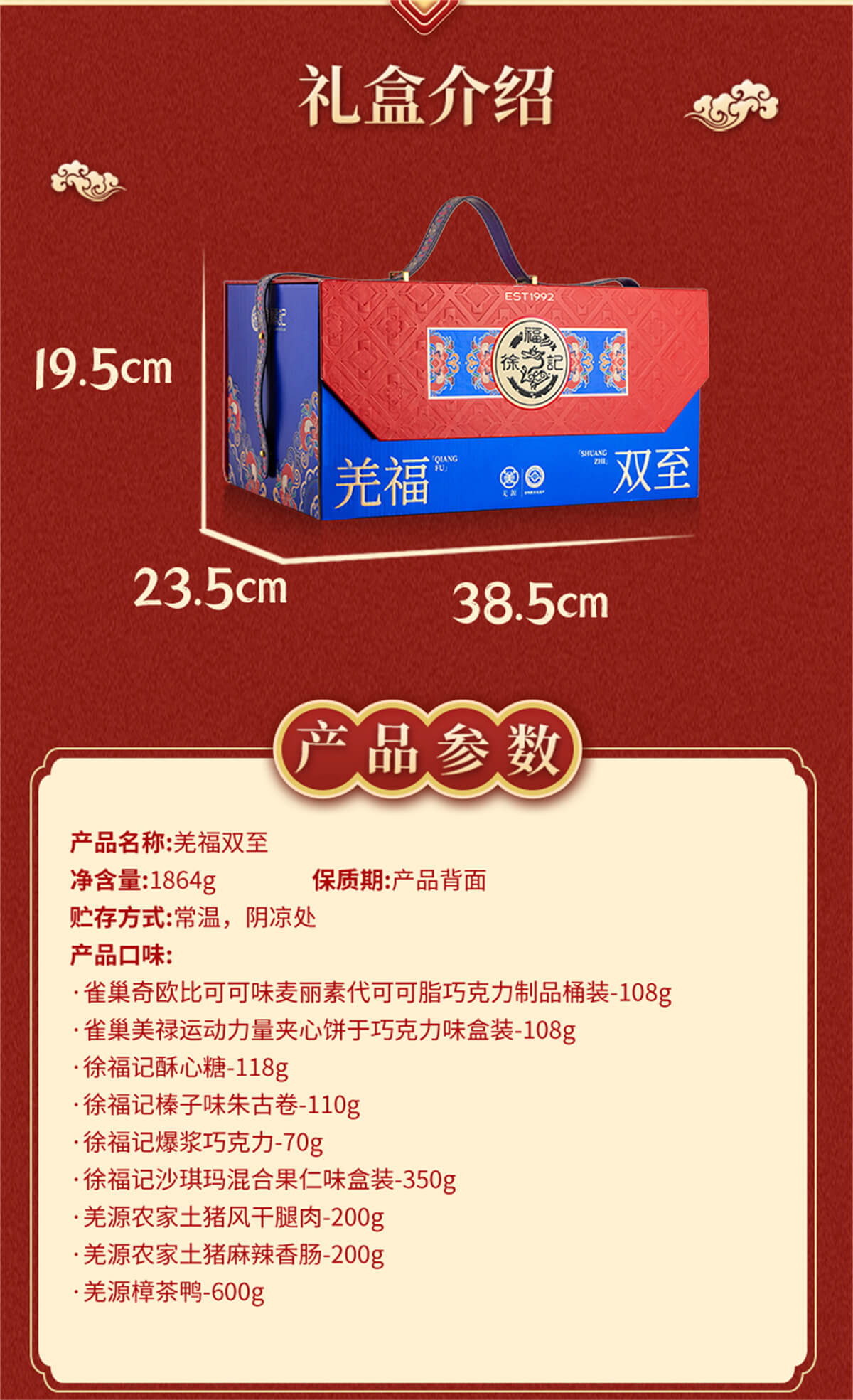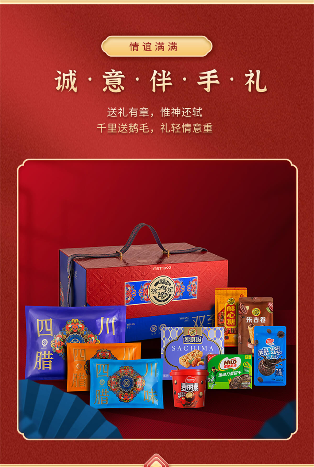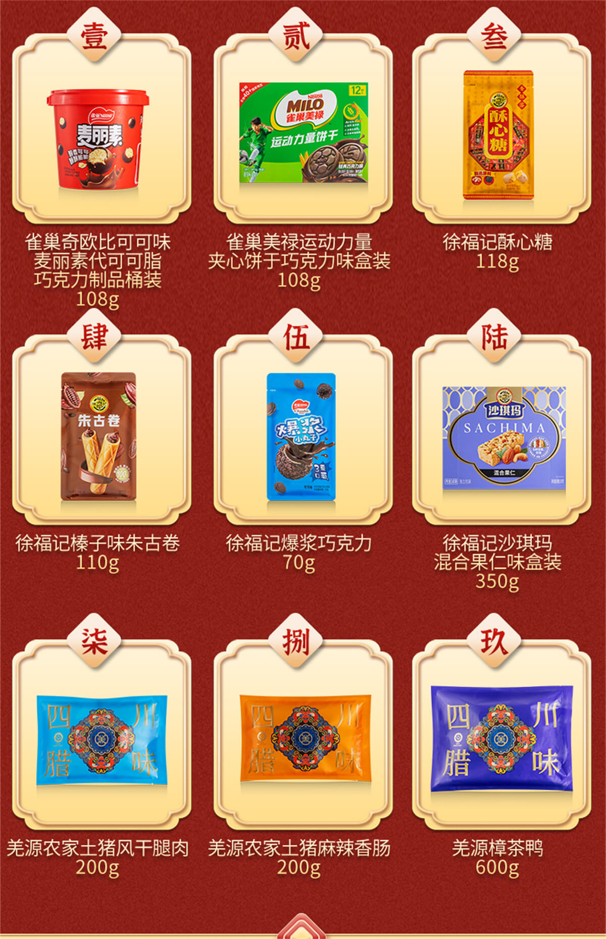 羌福双至 发布时间:2025-01-04点击:24 团购优惠请联系我们 内容物:雀巢奇欧比可可味麦丽素代可可脂巧克力制品桶装108g雀巢美禄运动力量夹心饼干巧克力味盒装108g徐福记酥心糖118g徐福记榛子味朱古卷110g徐福记爆浆巧克力70g徐福记沙琪玛混合果仁味盒装350g羌源农家土猪风干腿肉200g羌源农家土猪麻辣香肠200g羌源樟茶鸭600g 请填写您的信息 提交留言
